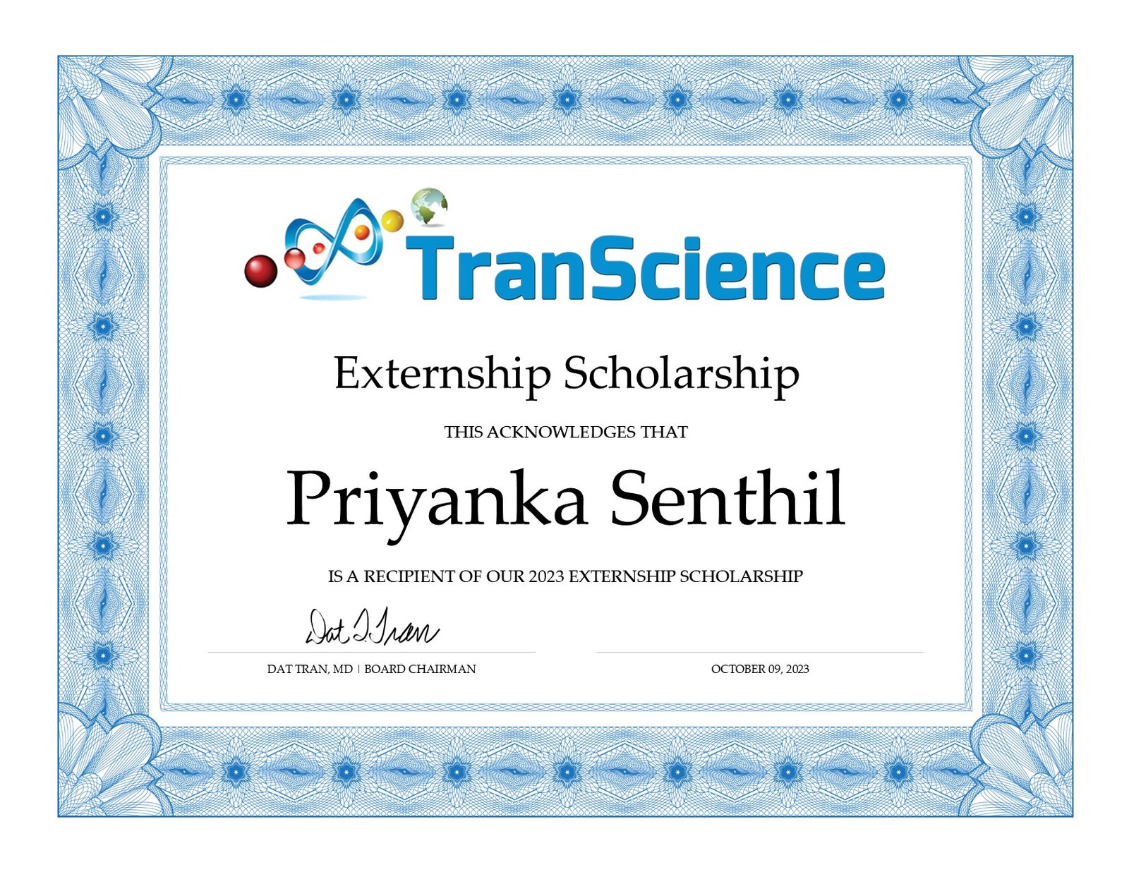This scholarship reflects TranScience’s mission to promote science, healthcare, and innovation through education, research, training, and hands-on experiential learning.